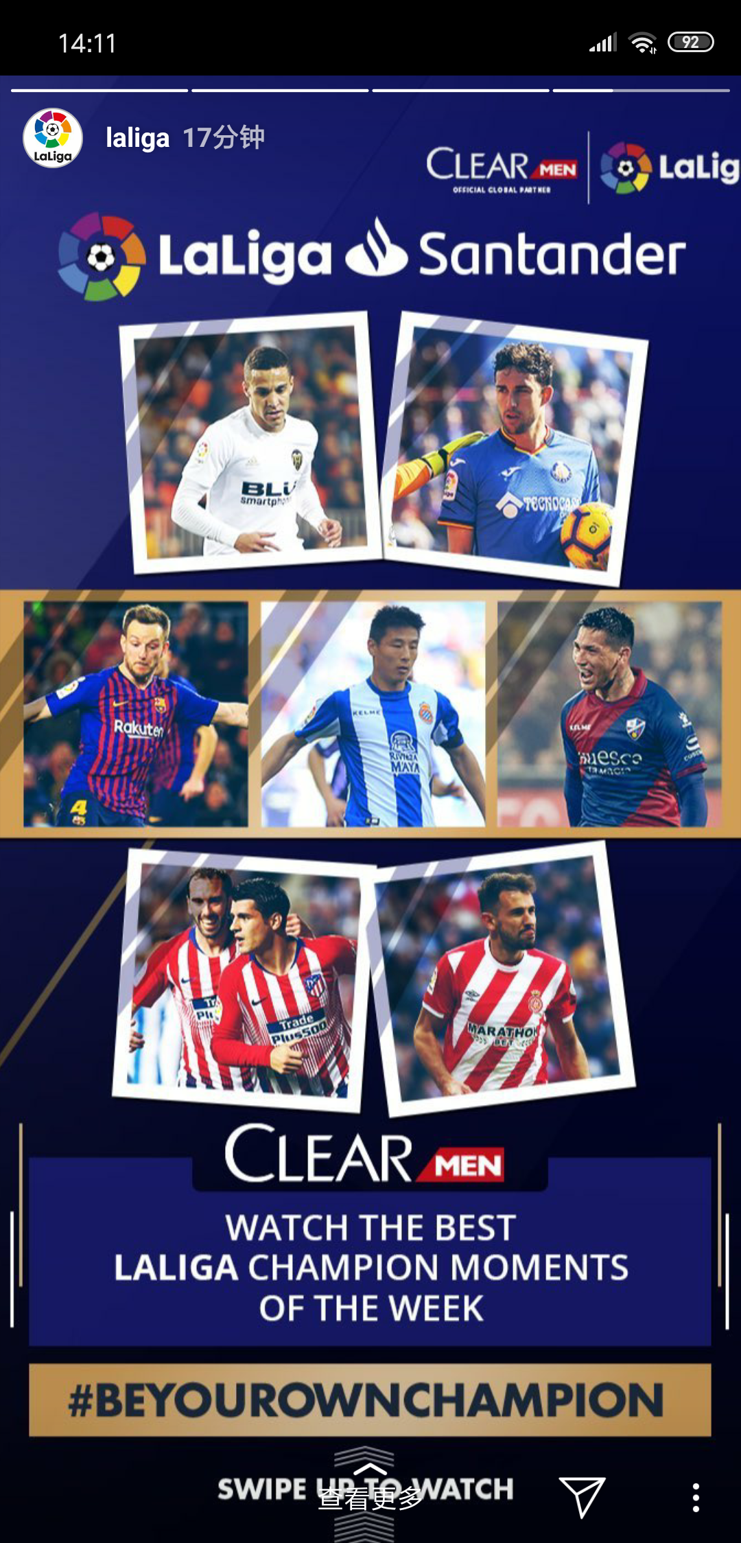 今天西甲官方发出27轮比赛的宣传海报,将武磊的照片置于拉基蒂奇、莫拉塔等球星中间,在上星期的比赛中打入一粒精彩进球的武磊已然成为了本轮西甲的看点之一,更何况有广大的中国球迷也一直关心着武磊的动态。