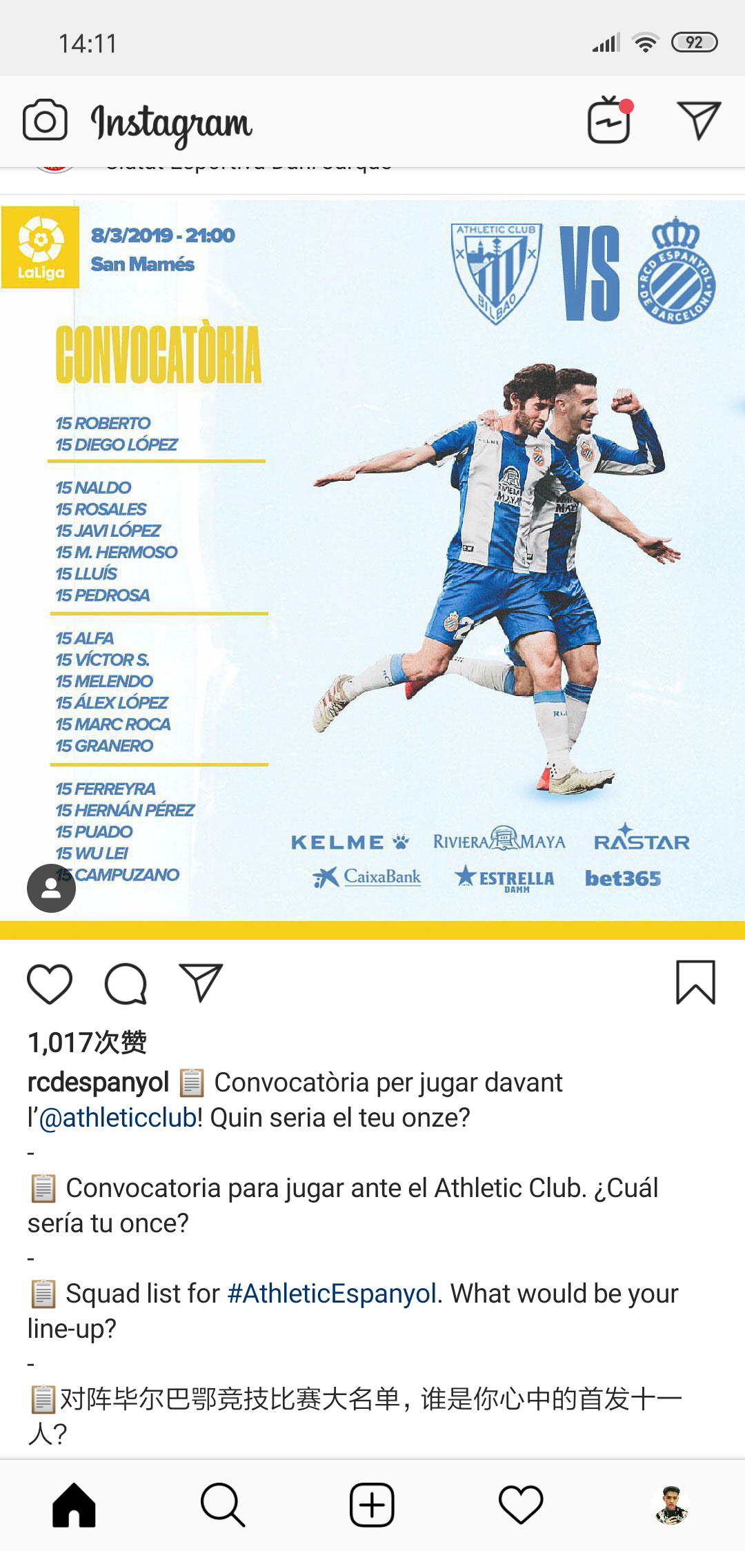 西班牙人俱乐部方面今天也发布了这一轮对战毕尔巴鄂竞技的球员大名单,武磊依旧出现在名单上。除了当地的加泰语,、西班牙语,以及通用的英语,西班牙人官方还特地用中文询问球迷们:“对阵毕尔巴鄂竞技大名单,谁是你心中的首发十一人?”对于咱们中国球迷来说,那必须是有武磊的。这轮比赛武磊的锋线搭档博尔哈-伊格莱西亚斯以及主力中场达德尔都累积黄牌停赛,武磊可能会搭档球队另一位新援费雷拉,一起扛起进攻大旗。值得注意的是,这份大名单上西班牙人球员全员15号,这还是为了给刚做完手术的15号戴维-洛佩兹加油,西班牙人确实是一个充满温情的球队。