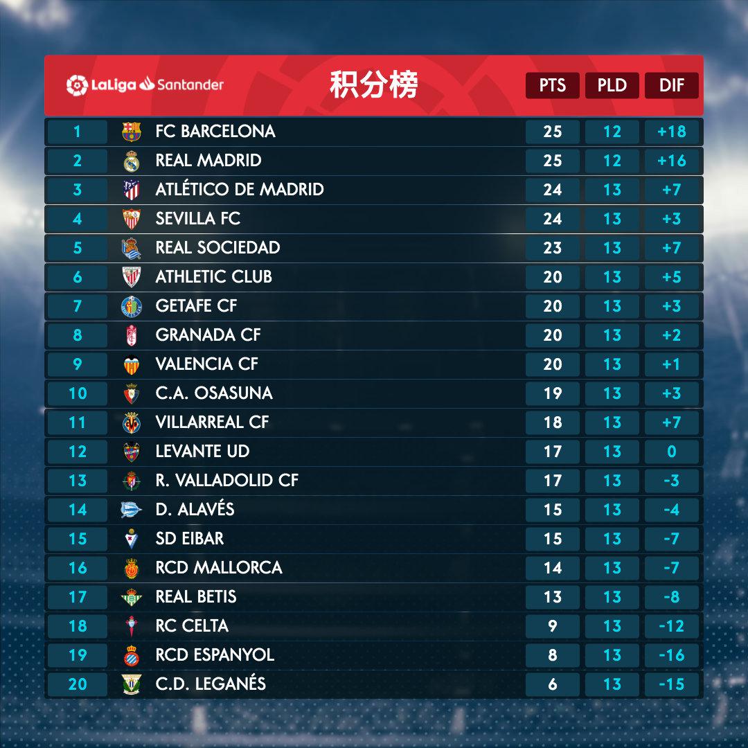 北京时间11月11日凌晨,19/20赛季西甲联赛第13轮结束了全部比赛。巴萨皇马同积25分,巴萨净胜球占优。马竞和塞维利亚都拿到24分,皇家社会以23分排名第五。在前五名球队中,分差只有2分。