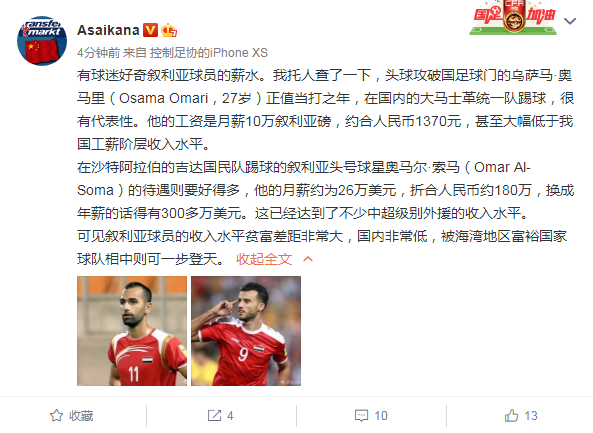 世预赛40强赛上,叙利亚2-1战胜了中国队,27岁的乌萨马·奥马里为叙利亚打入了第一粒进球。德转管理员朱艺查到了叙利亚球员的年薪,攻破球门的奥马里,月薪仅1370元。