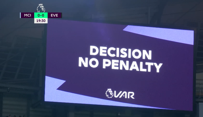 比赛第18分钟,费尔南迪尼奥后场长传球,马赫雷斯拿球后突入禁区,在和埃弗顿后卫迪涅身体接触后倒地,但边裁此时已经举旗示意马赫雷斯越位。曼城球员们对这次判罚并没有太大争议,但VAR却突然介入,要求重看视频慢镜头回放。随后VAR显示,马赫雷斯并未越位,边裁举旗判罚错误。