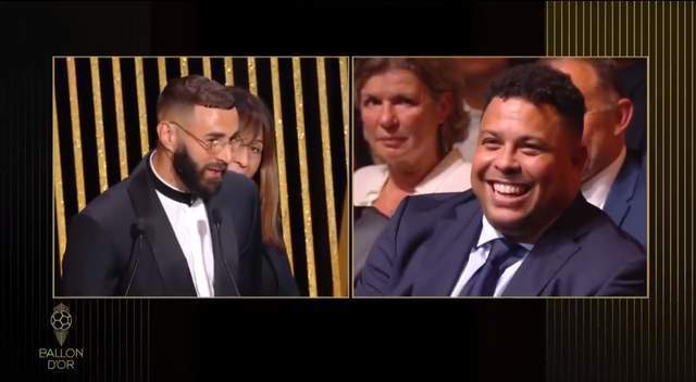 颁奖典礼上,本泽马两位儿时的偶像,齐达内和罗纳尔多都来到了现场。当本泽马上台领奖时,台下的大罗满面笑容。