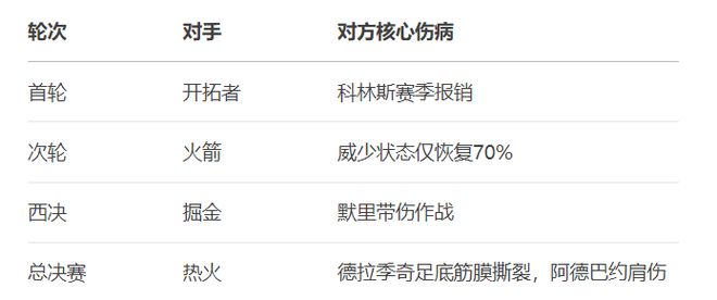 在季后赛期间,至少有9支球队缺少1名核心球员,而湖人队的核心阵容保持完整。