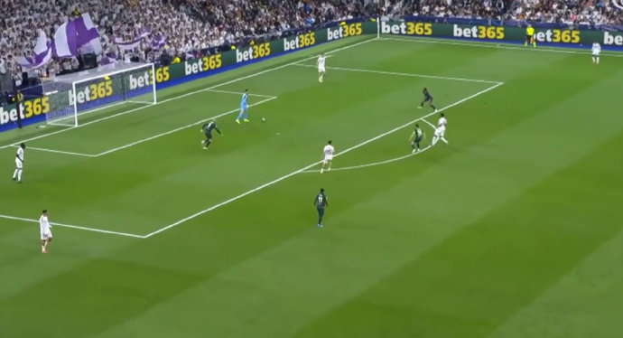 虽然库尔图瓦是一场运动战,但皇家马德里的后场队形是典型的“2-4”进球位置,这吸引了曼城的五名球员进入前场。中间圈有两个人,后防线只剩下三个人,这为皇家马德里的长传突袭提供了差距