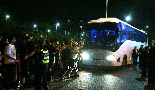 周日晚0-2输给菲律宾后,伊朗女足的公交车正在离开球场,突然被大约200名示威抗议者拦下。这些人围着公交车,拍打着车身,喊着“让他们走”。