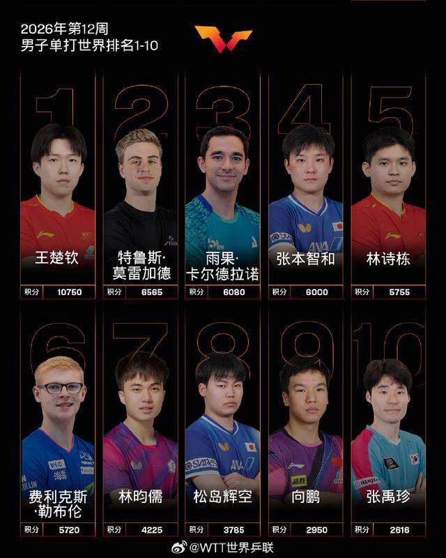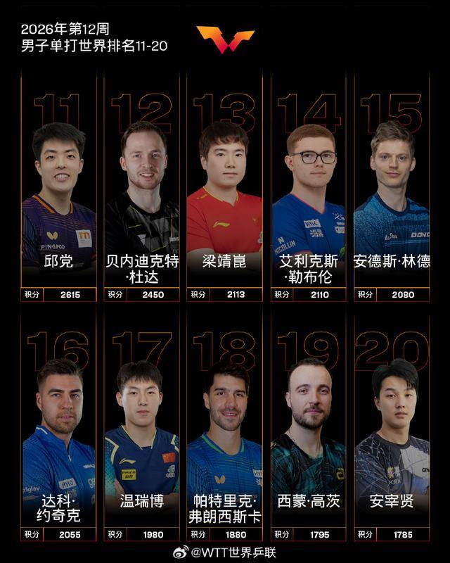WTT重庆冠军赛男单亚军温瑞博排名上升10个名次位列第17,刷新个人职业生涯排名新高;四强张本智和排名上升1个名次位列第4;八强雨果·卡尔德拉诺排名上升1个名次位列第3;八强邱党排名上升1个名次位列第11;十六强林文政排名上升8个名次位列第34;WTT支线赛奥托塞克站男单冠军马蒂亚斯·卡尔森排名上升23个名次位列第87。