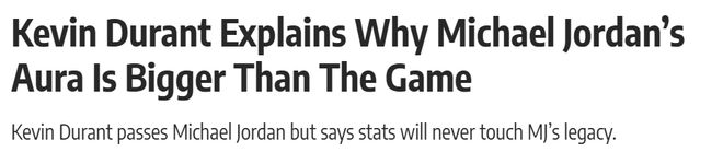 杜兰特的职业生涯也足够伟大。他是历史上最全能的得分手之一。他没有死胡同得分,去了很多球队,适应了很多系统,一直保持着巅峰水平。但他也坦言,自己和乔丹在文化影响力上还是有差距的。