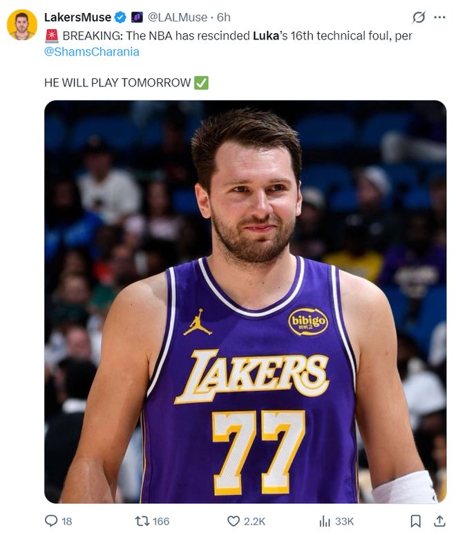 据ESPN名记Shams报道,北京时间3月23日,东契奇在对抗魔术时的技术犯规被取消,比塔泽的技术犯规也被取消,因此东契奇仍然积累了15次技术犯规,他可以参加活塞比赛。