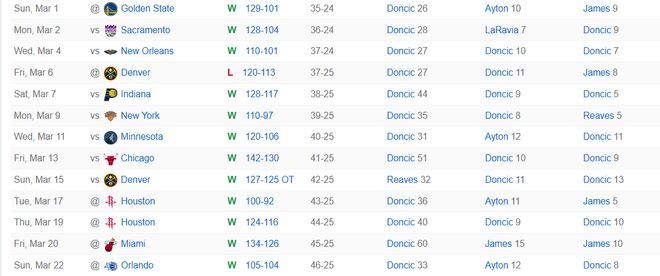 东契奇在这13场比赛中没有休息,场均36.5分钟,获得36分8.3篮板7.55助攻2.2抢断0.8盖帽,命中率49.4%,三分命中率39.8%,场均命中5.1个三分。